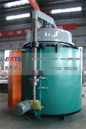 井式回火爐的結構,外殼由鋼板和型鋼制成圓柱形爐體。爐蓋內面采用不銹鋼板制成。爐襯采用輕質0.6g/cm3節能微孔耐火保溫磚砌筑。爐襯與爐殼夾層置硅酸鋁纖維氈保溫,間隙填充膨脹保溫粉。電阻絲采用0Cr25Al5高電阻合金絲繞成螺旋狀安裝在爐膛的擱絲磚上。爐膛內放置有不銹鋼裝料筐。爐蓋采用手動扛桿升降。為了使工件均勻加熱,在爐蓋上安裝有耐熱不銹鋼軸和風葉制成的熱風循環風機,工件在加熱過程中,熱空氣在回火爐內上下循環以保證工件均勻加熱。為保證操作在升降機構附近裝有限位開關,此開關與回火爐控制柜電源聯鎖,爐蓋關閉時(工作時)接通電源。當爐蓋開啟時限位開關即切斷控制電源,因此加熱元件的電源同時切斷,以保證操作。井式回火爐出廠時配套自動控溫柜,熱電偶。