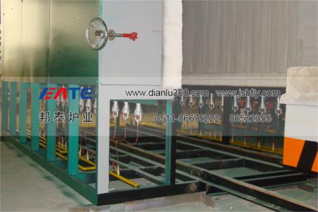 3、臺車骨架由各種大型工字鋼、槽鋼、角鋼及厚鋼板等組合焊接而成。臺車傳動采用電動機、蝸輪減速機組合通過鏈條帶動前端主動輪傳動。臺車耐火砌體采用高鋁定型磚結構,與爐體密封效果好,耐壓強度高。臺車與爐體密封采用軟接觸的方法,并在臺車下部設有迷宮式沙封槽及沙封刀密封裝置。<br>3、爐門采用側開式,簡單方便,密封采用手輪壓緊機構。