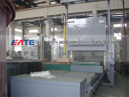 臺車框架采用型鋼焊接成形,其鋼性保證在滿負荷下不變形。內用耐火磚砌筑,易碰撞部位和承重部位用重質磚砌筑,增強爐襯結構強度,臺車的行走采用自行式結構,由減速機傳動鏈輪帶動走輪在軌道上行走。臺車密封采用自動迷宮式結構和軟接觸雙密封,臺車進入爐內通過凸輪及滾輪斜面作用,自動升起后進行密封。臺車開出,該密封槽自動落下,密封槽內密封砂經加滿后即不必經常添加。臺車開出,爐門升降均為電動控制,配有電磁制動器,可防止慣性撞擊爐體,并且連鎖控制,即稍打開爐門后,自動切斷加熱元件,同時恢復臺車行走機構電源。爐門關閉到位后,自動切斷臺車行走機構電源,同時恢復加熱元件電源。